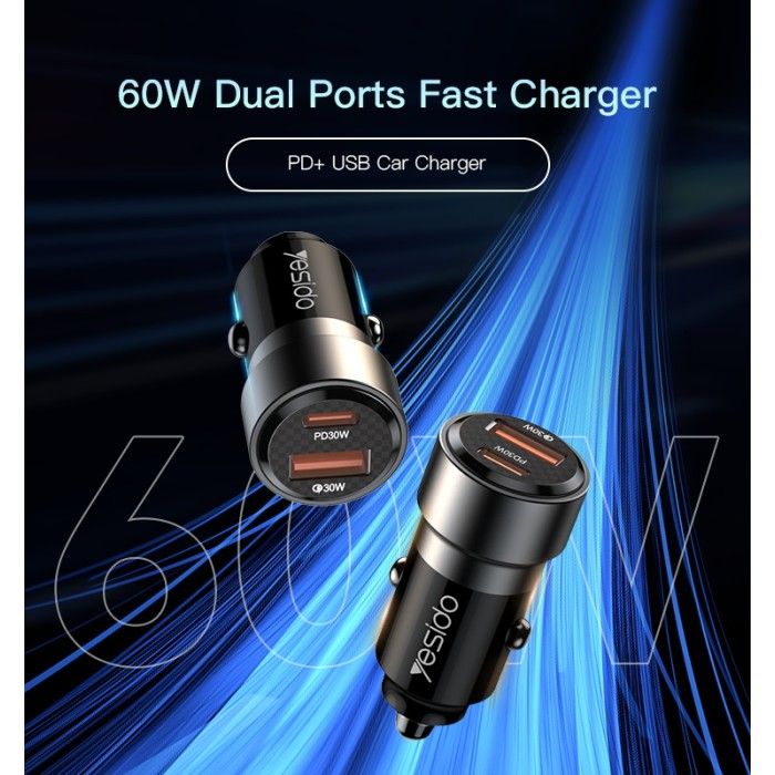 Yesido Car Charger 1x USB-A 1x USB-C 60 Watt with USB-C to Lightning Braided Cable
